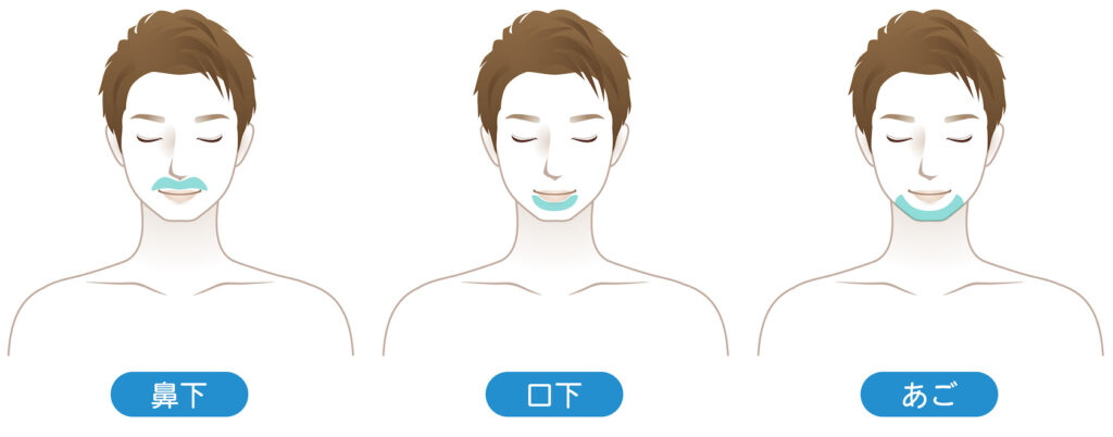 ヒゲ脱毛は両頬、鼻下・顎・唇下、顎下〜首、ヒゲ全体(左記3つ全て)の中からお選びいただけます。(複数選択可能)